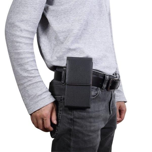 Universal, svart midjeveske i størrelsen 16,5 x 8,3 x 1,8 cm, som f.eks passer til mobiltelefoner. Vesken er av holdbart PU-lær og du fester enkelt vesken i beltet med spennen på baksiden.