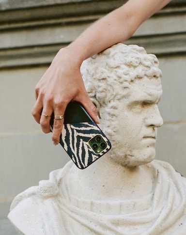 Tilføy en signatur til din telefon ved å velge et av våre unike design. Dette dekselet kommer i et håndlaget, beskyttende design med forhøyede kanter rundt kamera og skjermen. Laget av resirkulerte og ikke-animalske materialer.