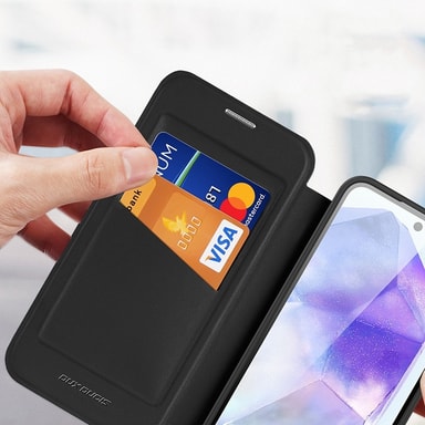 Praktisk funksjonalitet: Med magnetlukking og to kortspor tilbyr dette dekselet både sikkerhet og brukervennlighet for dine daglige behov.