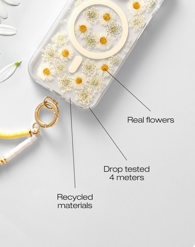 Legg til et gjennomsiktig ekstra lag med beskyttelse til telefonen din med et unikt designet gjennomsiktig deksel som inneholder ekte blomsterblader nøye plassert for hånd. Dette dekselet er dropptestet og gir skreddersydd, heldekkende beskyttelse med hevede kanter for å beskytte kameraet og skjermen. Laget av resirkulert og dyrevennlig materiale.