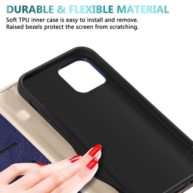 DESIGN: Ultratynt mobiltelefondeksel i bokstil med kortspor, stativfunksjon, integrert TPU silikondeksel og en magnetisk lukking uten plagsom klaff.