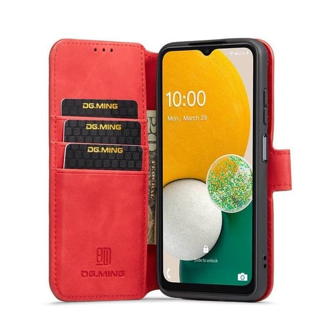 DG-Ming mobillommebok 3 kort Samsung Galaxy A04s Denne mobillommeboken fra produsenten DG-Ming er laget av materialer av høy kvalitet for å sikre holdbarhet og lang levetid. PU-skinnmateriale kjent for sin styrke og motstand mot slitasje. Innsiden er foret med mykt mikrofiber for å forhindre riper på telefonen. Et slankt lommebokdeksel designet for å gi fullstendig beskyttelse til din Samsung Galaxy A04s samtidig som det gir et stilig utseende. Kortspor og seddelrom DG-Ming-lommeboken har tre kortspor. Kortsporene er designet for å oppbevare kredittkortene dine, ID-en og andre viktige kort. Lommeboken har også et seddelrom for kvitteringer og regninger, slik at du ikke trenger å bekymre deg for å måtte ha med deg en ekstra lommebok eller veske. En komplett og praktisk løsning for de som foretrekker å bære sine essensielle gjenstander på ett sted. Design DG-Ming-lommeboken tilpasset Samsung Galaxy A04s er laget i et slankt design. Dette gjør mobillommeboken slank og lett, så den er lett å ha i lommen. Telefonen er montert i et silikondeksel laget av slitesterkt TPU materiale som er modelltilpasset til Samsung Galaxy A04s, noe som gjør at telefonen din er sikkert festet til dekselet uten fare for at den sklir ut. Dekselet har en integrert stativfunksjon, perfekt for for eksempel å se på film. En magnetisk lukking holder lommeboken lukket. Dekselet beskytter hele telefonen, noe som gjør den til et perfekt valg for de som leter etter praktiske funksjoner mens de foretrekker et minimalistisk design