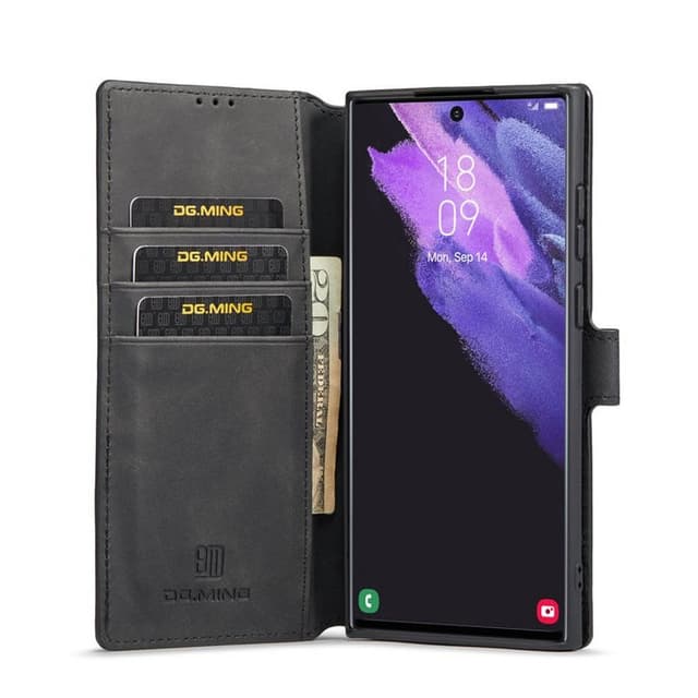 DG-Ming vintage mobil lommebok, designet med tilgang til telefonens funksjoner. Telefonen holdes på plass av et modellutstyrt, slitesterkt silikondeksel. Saken åpnes og lukkes lett med magnetlås. Angi funksjon, perfekt for filmvisning. Spesifikasjoner Spor: 3 stk Seddel: 1. Dette produktet er kompatibelt med: Samsung Galaxy S23 Ultra Materiale: Pu skinn Produsent: DG-Ming