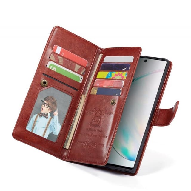 Saken åpnes og lukkes lett med en skjult magnetlås. Denne lommebokdekseln er designet med plass til hele 9 kredittkort inkludert en fotolomme. Sporene er lukket med en knappelås, 3 sedler. Baksiden av kredittkortsporene er glatt som beskytter skjermen.