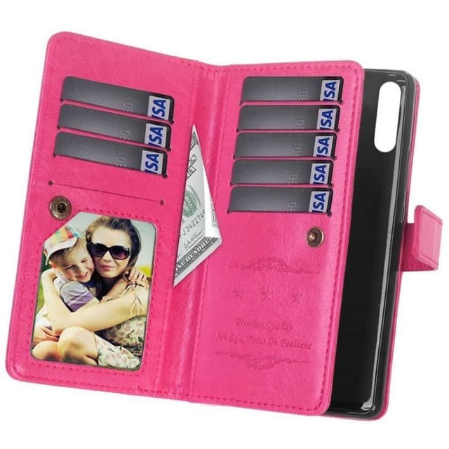 Mobil lommebok Dobbelt flip 9-kort - Holdbar silikonramme (flexi) holder telefonen på plass. - Skjult magnetlås holder mobil lommeboken lukket. - Sporene er lukket med en knappelås. - Glatt side som beskytter telefonens skjerm. Spesifikasjoner Farge: Sort, brun, rød, rosa, hvit, lys blå Antall kortspor: 9 (hvorav 1 fotolomme) Antall sedler: 2 stk Bilde lommer: 1st Annet: Hull for håndleddsstropp Passer: Samsung Galaxy A70 Modellnr: SM-A705F (6.7"") Materiale: PU skinn