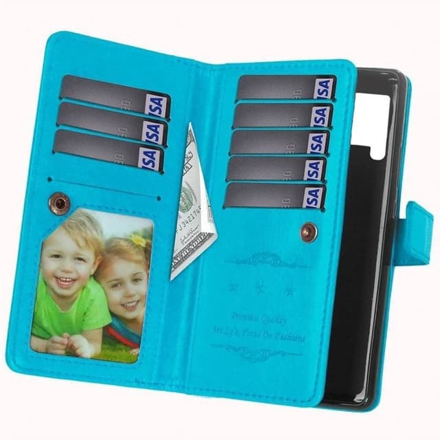 Mobil lommebok Dobbel flip Flexi 9-kort - Slitesterk silikonramme (flexi) holder telefonen på plass. - Skjult magnetlås holder mobil lommeboken lukket. - Kortsporene er lukket med en knappelås. - Glatt side som beskytter telefonens skjerm. Spesifikasjoner Farge: Svart, brun, rød, rosa, hvit, lyseblå Antall spor: 9 (hvorav 1 fotolomme) Antall seddelommer: 2 stk Fotolommer: 1. Annet: Hull for håndleddsstropp Passer til: Samsung Galaxy A12 Modell nr: SM-A125F (6.5"") Materiale: PU-lær