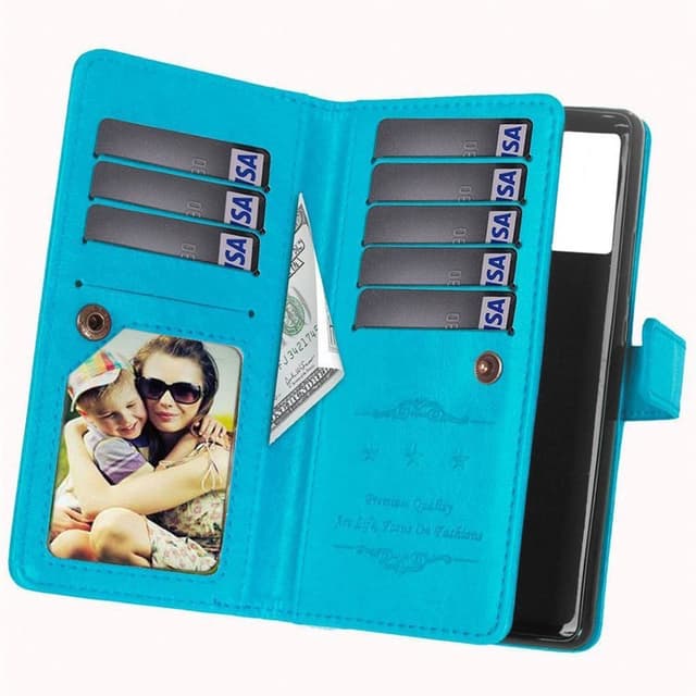Mobil lommebok Dobbel flip Flexi 9-kort - Slitesterk silikonramme (flexi) holder telefonen på plass. - Skjult magnetlås holder mobil lommeboken lukket. - Kortsporene er lukket med en knappelås. - Glatt side som beskytter telefonens skjerm.Spesifikasjoner Farge: Svart, brun, rød, rosa, hvit, lyseblå Antall spor: 9 (hvorav 1 fotolomme) Antall seddelommer: 2 stk Fotolommer: 1. Annet: Hull for håndleddsstropp Passer til: Samsung Galaxy A21s Modell nr: SM-A217F (6,5 "") Materiale: PU-lær