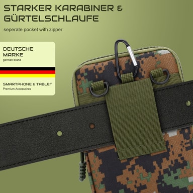 Etuiet er laget av sprutsikker og slitesterk polyester av høy kvalitet, og er robust og beskytter enhetene dine mot riper og skader. Det kamuflasjemønstrede designet gir vesken en stilig, militær design som passer til friluftsutstyret ditt.