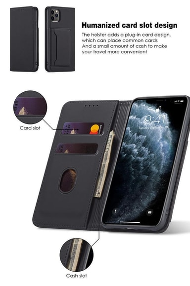 Denne lommebokvesken til iPhone 12 Mini er laget av høykvalitets PU og TPU materiale. Det gir full beskyttelse av telefonen og beskytter mot fall og støt. Med flere kortspor.