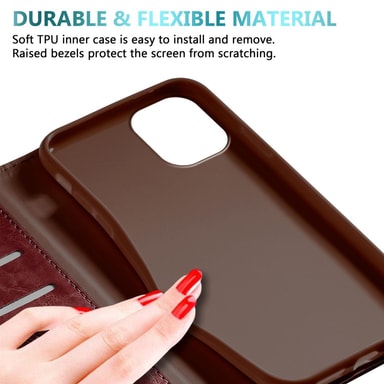 DESIGN: Ultratynt mobiltelefondeksel i bokstil med kortspor, stativfunksjon, integrert TPU silikondeksel og en magnetisk lukking uten plagsom klaff.