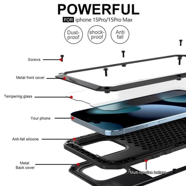 iPhone 15 Pro Max Heavy Duty Robust Hybrid-deksel+Herdet Glass