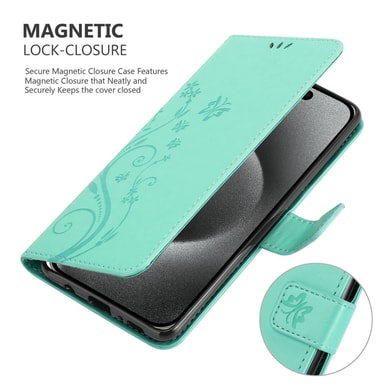 iPhone 16 PRO MAX lommebokdeksel Blomster (Turkis)