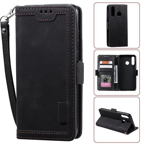 Lommebokdeksel med støtdempende TPU deksel innerst og kortholder til Huawei Y6(2019). Et elegant og funksjonelt beskyttelsedeksel med stativfunksjon for horisontell visning samt flere rom for kredittkort, visittkort, sedler og foto. Dekselet er laget av solid PU-lær med dekorativ søm, magnetspenne og håndleddsreim. Enkel tilgang til telefonens alle porter og knapper uten å ta av dekselet.