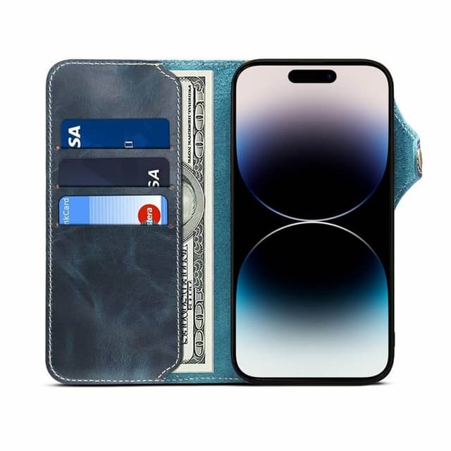 Eksklusiv og praktisk mobil lommebok laget av ekte lær Beskytter mobiltelefonen effektivt mot skitt, riper, støt. Utstyrt med et rom for f.eks bankkort, ID-kort, førerkort, sedler, kvitteringer osv. Den mobile lommeboken er designet med tilgang for volumknapper, høyttalere, mikrofon, kamera og ladestikk, etc. Telefonen holdes på plass av en modelltilpasset ramme laget av slitesterk silikon / Tpu. Knapplås holder lommeboken lukket. Spesifikasjoner Produkt: Mobil lommebok Lær 3-kort Farge: Blå Antall kortspor: 3 stk Antall seddelommer: 1. Kompatibilitet: Apple iPhone 14 Pro Modell nr: A2890 Materiale: Ekte lær