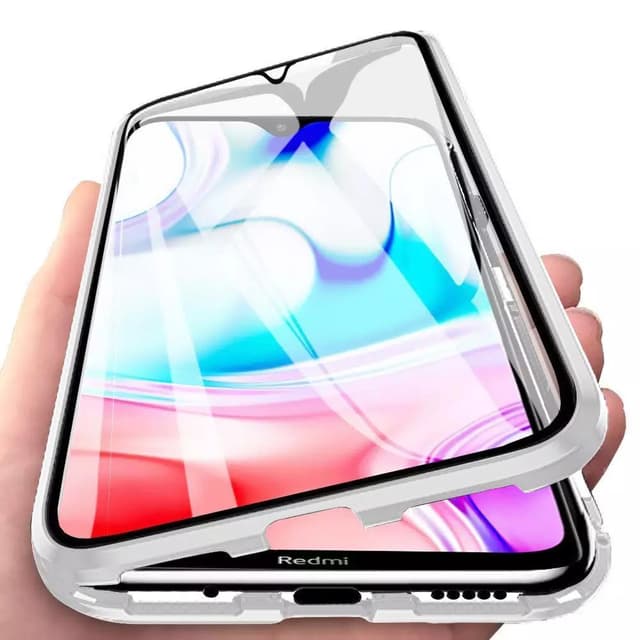 Mobildeksel designet for Xiaomi Redmi 8. Den gjennomsiktige designen gjør at du ikke skjuler telefonen din, men samtidig holder den beskyttet. Både fronten og baksiden er produsert i herdet glass som beskytter mot riper og skitt og betyr at ingen fingeravtrykk setter seg fast. Rammen er laget av aluminium og har magnetisk adsorpsjon som har innebygde magneter rundt hele skallet som holder fronten og baksiden sammen. Dette gjør dekselet enkelt å feste når du bare legger telefonen i dekselet og magnetene og deretter lukker det. Saken har presise utskjæringer for høyttalere, kamera, ladeuttak og knapper, noe som betyr at ingen funksjoner hindres, og du kan bruke telefonen akkurat som vanlig. Ettersom dekselet har en innebygd skjermbeskytter i herdet glass, trenger du ikke en egen skjermbeskytter på telefonen.