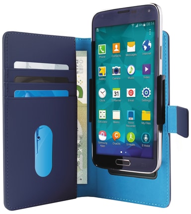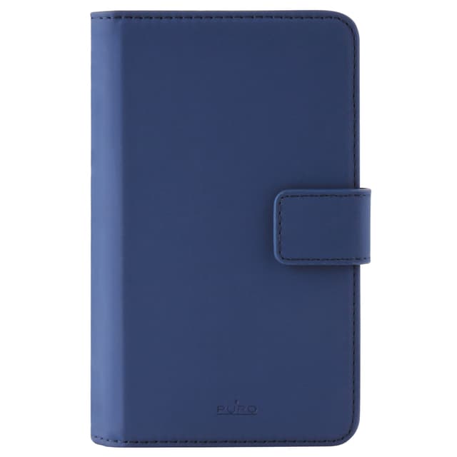 Puro Universal mobiletui beskytter telefonen mot riper og støt. Magnetisk lukking hindrer at etuiet åpnes ved et uhell og gir enkel tilgang til mobiltelefonen. På innsiden finner du tre kortlommer og en lomme for kontanter. Takket være justerbare braketter passer etuiet til mange telefoner. Dette etuiet har en stilig blå farge og størrelse XL.