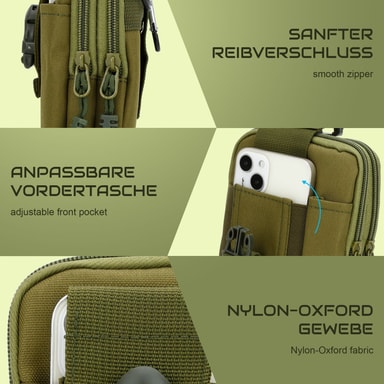 Molle-stroppen på baksiden gir fleksible festealternativer til belte, ryggsekk eller vest. Den medfølgende skulderstroppen gir et ekstra bærealternativ. Denne allsidigheten gjør vesken til en uunnværlig følgesvenn.