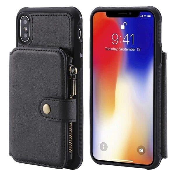 Lommebokdeksel med støtdempende beskyttelse og kortholder til iPhone X / XS. Et elegant og funksjonelt beskyttelsedeksel med stativfunksjon for horisontell visning samt flere rom for kredittkort, visittkort, sedler og fotografier. Dekselet er laget av solid PU-lær med dekorativt glidelås og spenne. Du har fri tilgang til telefonens alle porter og knapper uten å ta av dekselet.