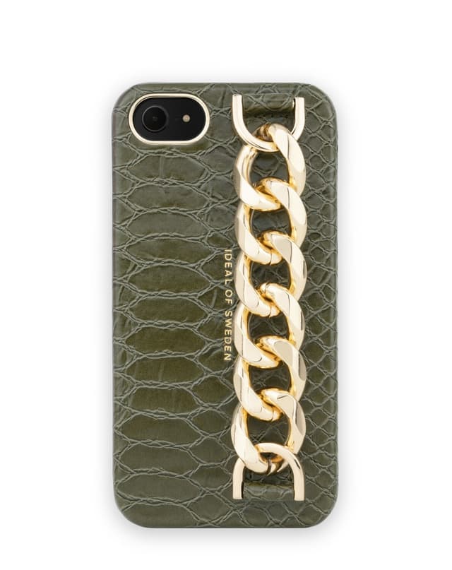 Green Snake oppfordrer til naturlig selvtillit med sin fantastiske mørkegrønne nyanse og får frem den tidløse følelsen med slangeskinnsmønster. Som en verdifull og sjelden perle henter dette designet inspirasjon fra naturens kraft og mulighet til å forvandle det hverdagslige til noe magisk. Statement Case har gullfargede detaljer rundt kameraet og et tykt kjettinghåndtak som gir et perfekt grep rundt telefonen din.