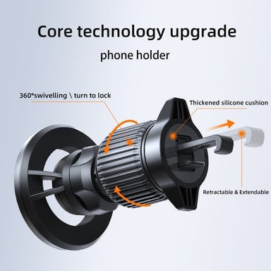 Luftventilmontering: Vår biltelefonholder har en sikker klipsdesign som enkelt festes til bilens luftventil. Denne plasseringen gir optimale visningsvinkler uten å hindre frontruten. Den robuste klipsen sikrer et fast grep på ventilen, og forhindrer at holderen rister eller løsner. Luftventilfestet er kompatibelt med de fleste bilmodeller og tilbyr en enkel, verktøyfri installasjon. Hold telefonen innen rekkevidde samtidig som du opprettholder en klar sikt over veien, noe som forbedrer sikkerheten og bekvemmeligheten under kjøring. Ideell for bruk av GPS-navigasjonsapper, håndfrie samtaler eller kontroll av musikken din.