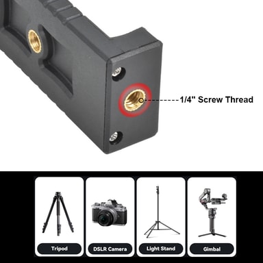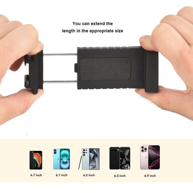 Mobiladapteren kan enkelt monteres på et kamerastativ – perfekt for å ta selfies, vlogge og mer. Mobilholderen har en justerbar størrelse. Gjør det mulig å legge til mikrofon, fotolys og annet utstyr.