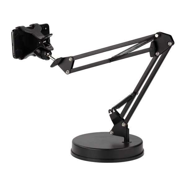 Universalt Smartphone-stativ med vektet base, kompatibel med de fleste smarttelefoner mellom 4 og 6,3. Armen er konstruert av stål og kan justeres i høyden ved hjelp av tommelhjul og fjærer.