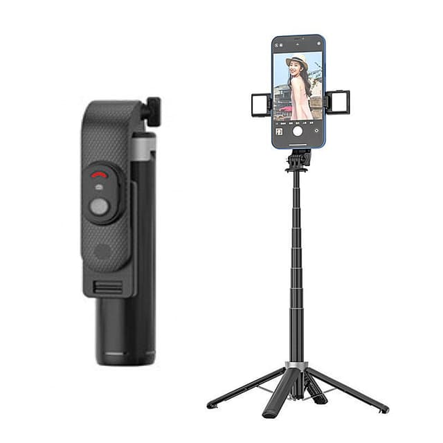Den er utstyrt med 2 avtakbare lys, ni lysmoduser og 3 lysfarger. Uttrekkbar stangdesign, kjøl av aluminiumslegering for stabil støtte. Tillat 360° rotasjon av mobiltelefonen.