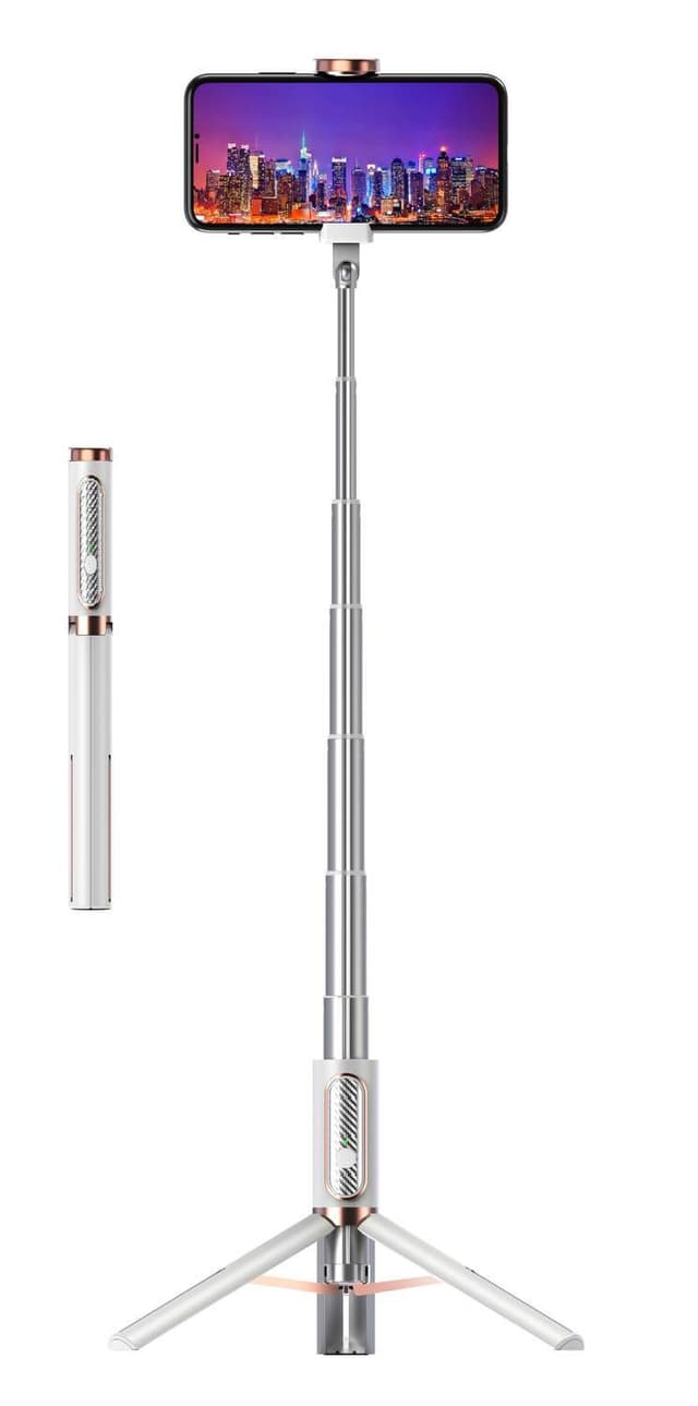 Bluetooth-selfie-pinne i alt-i-ett-design: Et integrert premium mobilstativ, det vakler ikke og vippes, men er stabilt og holder også store mobiltelefoner trygge. Du kan enkelt gjøre dette stativet om til en selfiestang.