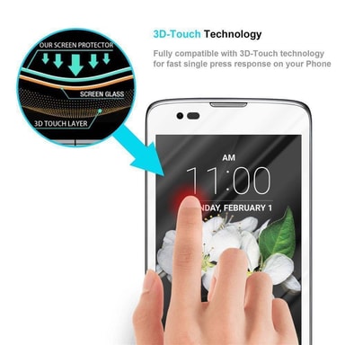 Skjermbeskytter for LG K8 2016 9H-hardhet med 3D Touch-kompatibilitet. Perfekt beskyttelse for din mobiltelefon. Laget av spesialbehandlet glass. Beskyttelsesglasset forlenger levetiden til skjermen. Vi anbefaler også å bruke et dekselLes mer om produktet