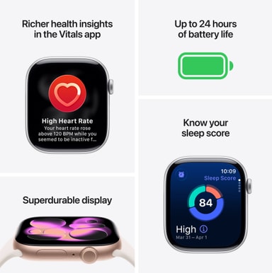 Apple Watch Series 11 lar deg ta bedre vare på helsen din med varsler om høyt blodtrykk, og du kan nyte en lengre batterilevetid. Den har videre også en fornyet Workout-app, og den kan skaffe deg hjelp i medisinske nødsituasjoner.Les mer om produktet