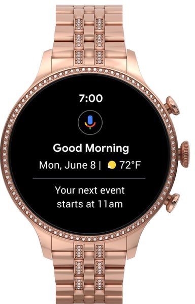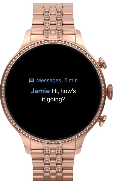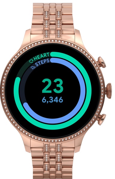 Fossil Gen 6 tilbyr en rund, farget touchskjerm med urskiver du selv kan velge og endre på etter ønske. Den lar deg sjekke telefoner, e-poster, tekstmeldinger, notifikasjoner fra apper og sosiale medier, kalender og alarmklokke.