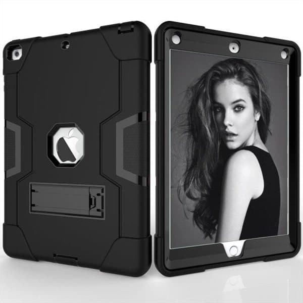 Shockproof deksel med stativ, til iPad Air . Beskyttelsedekselet er laget av 2 lag hard PC-plast med et ytre lag av myk silikon og den tettsittende passformen gir en effektiv beskyttelse mot smuss, støv, riper, slag, fall og annen slitasje samtidig som alle porter og knapper på enheten er lett tilgjengelige. Det smarte utfoldbare stativet gir deg frie hender og en behagelig vinkel når du ser på bilder og film.