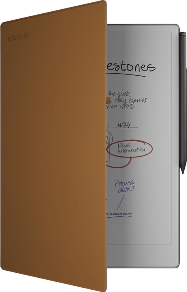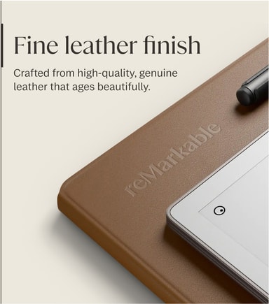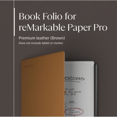 reMarkable BookFolio Pro har som mål å holde reMarkable Pro-enheten din trygg og stilig. Det førsteklasses skinndekselet fremhever stilen din og festes magnetisk til enheten, samtidig som det er plass på siden til reMarkable Marker. reMarkable Book Folio har intelligente funksjoner og førsteklasses materialer, og sørger for at det digitale papirbrettet ditt beskyttes med stil, samtidig som det forbedrer arbeidsflyten din.