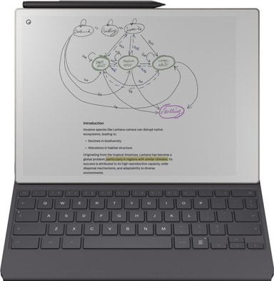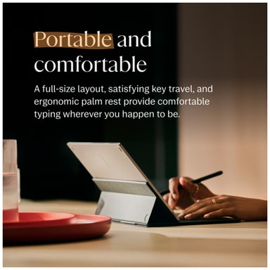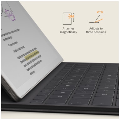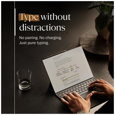 Når du åpner tastaturet, roterer skjermen automatisk slik at du kan veksle mellom frihånd og skriving. Kommentarer knyttes intelligent til den skrevne teksten etter hvert som du flytter den opp og ned på siden. Og uten lading, sammenkobling eller kabler er det alltid enkelt å skrive.