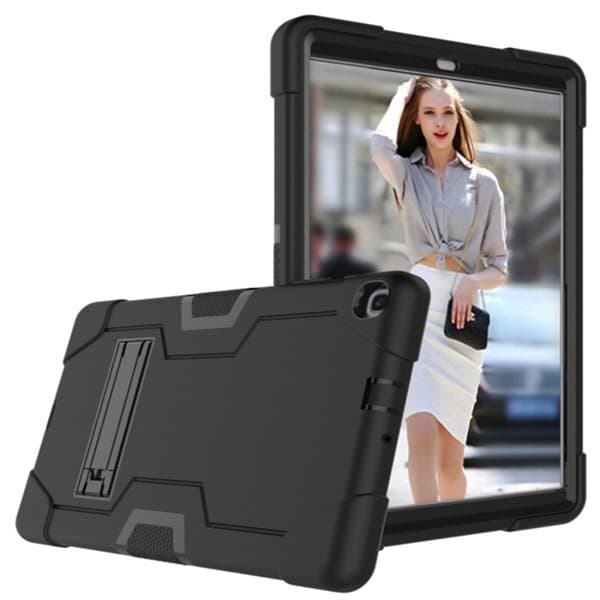 Shockproof deksel med stativ, til Samsung Galaxy Tab A 10.1 2019. Beskyttelsedekselet er laget av 2 lag hard PC-plast med et ytre lag av myk silikon og den tettsittende passformen gir en effektiv beskyttelse mot smuss, støv, riper, slag, fall og annen slitasje samtidig som alle porter og knapper på enheten er lett tilgjengelige. Det smarte utfoldbare stativet gir deg frie hender og en behagelig vinkel når du ser på bilder og film.