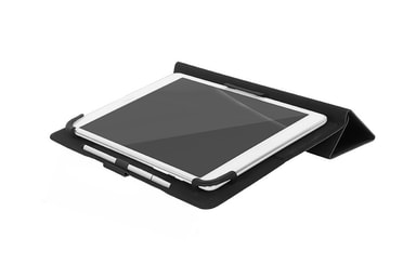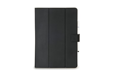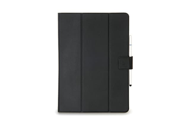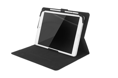 Universelt etui for nettbrett på opptil 11 tommer med magnetisk lukking og internt stativ, laget av mykt og økologisk skinn som er behagelig å ta på. Interiør med tre silikonhjørner, én fast og to som kan tilpasses størrelsen på nettbrettet.