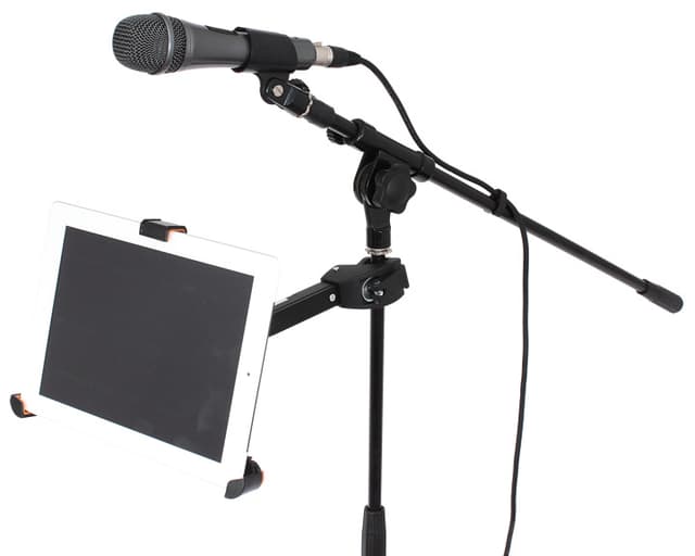 Øverste benlengde justerbar fra 26 til 64 mm Fleksibel vinkel mellom to ben på 36 ° til 180 ° 360 ° rotasjon for å se din skjerm i stående eller liggende format Fri ± 30 ° skrå silikonføtter, som holder din iPad perfekt på plass Lengde på aluminiumarm: 150 mm Diameter på rørklemmer 14-28 mm Materiale: Aluminium og plast Bemerk at mikrofon, tablet og mikrofonstativ på bildet ikke medfølger