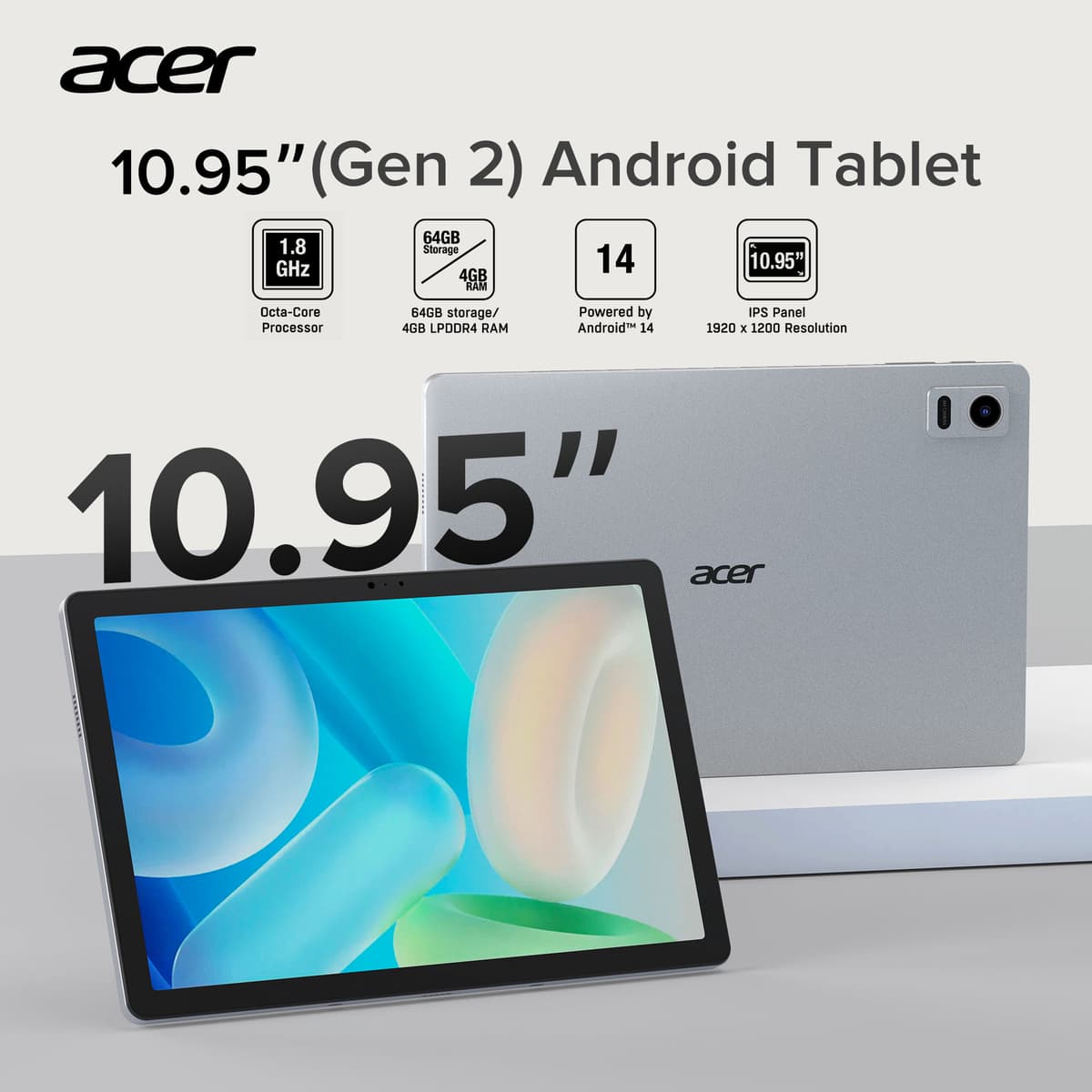 Acer ACTAB1125E 4/64GB 10,95" nettbrett har en IPS-skjerm med Full HD-oppløsning for klare bilder, brukervennlig Android 14 og 11 timers batterilevetid for å håndtere hverdagslige oppgaver med letthet.Les mer om produktet