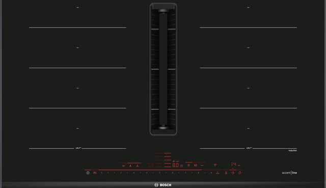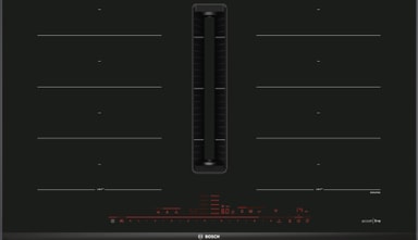 Denne induksjonstoppen fra Bosch har et integrert ventilasjonssystem. Det fjerner damp og uønsket lukt fra matlagingen på en pålitelig måte.