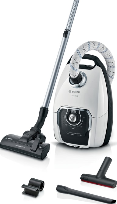 Bosch Series 8 støvsuger BGL8WH3 er en brukervennlig og praktisk støvsuger med 12 m ekstra lang kabel, HEPA-filter for renere luft under støvsugingen og et sett med tilbehør som gjør støvsugingen til en lek.