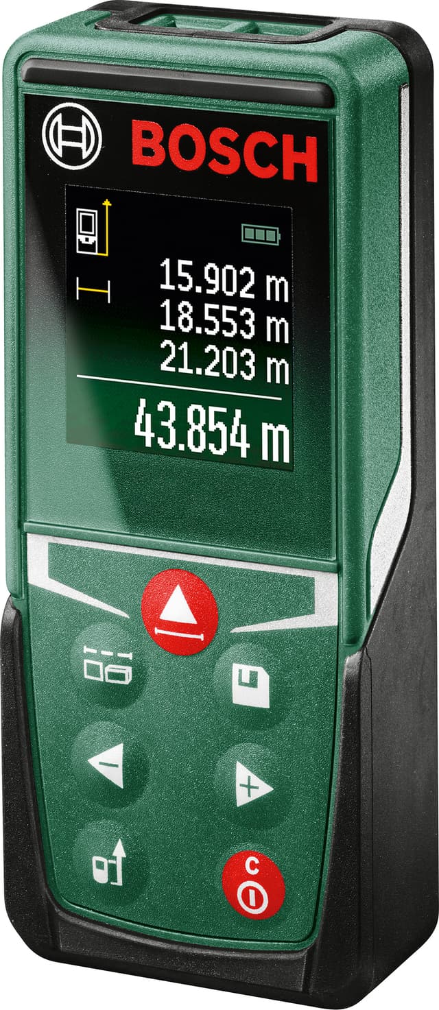 Måleinstrumentet Bosch Universal Distance 50 B0603672800 hjelper deg med å gjøre presise målinger opptil 50 m med en nøyaktighet på 2 mm. Det driftes av to AAA-batterier og kommer med minnefunksjon.