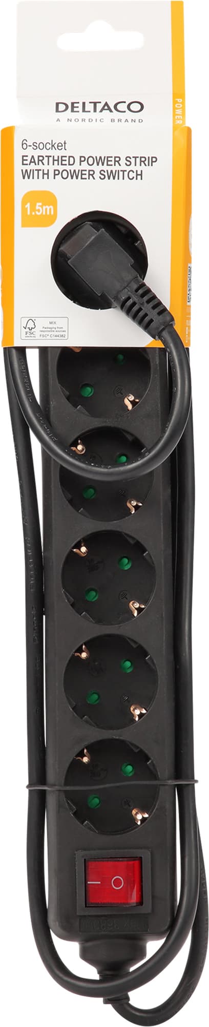 Deltaco grenuttak GT-0660 har en rund skjøteledning på 1,5 m som ender i seks CEE-strømuttak. De er barnesikret og jordet for ekstra sikkerhet og brukervennlighet.
