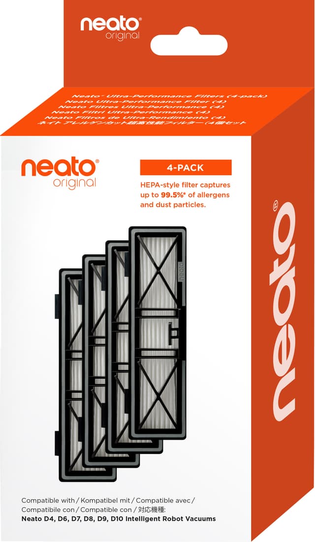 Ha Neato Ultra-Performance filtre tilgjengelig og sikre at din robotstøvsuger kan fange opptil 99,5 % av alle allergener og fine støvpartikler, noe som vil gjøre hjemmet ditt et renere og mer helsevennlig sted å være. Pakken inneholder fire filtre, og filtrene er kompatible med Neato-robotstøvsugerne D4, D6, D7, D8, D9 og D10.