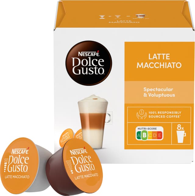 Prøv vår NESCAFÉ Dolce Gusto Latte Macchiato, det perfekte valget for deg, enten det er tidlig om morgenen eller du tar deg en pause fra jobben. Våre dyktige kaffeskapere har perfeksjonert Nescafé Dolce Gusto Latte macchiato-oppskriften med to kapsler: en kapsel for espressoen, en spesiell blanding av glatte og fruktige søramerikanske Arabica premium-kaffebønner, og en annen kapsel for den skummende helmelken. I hjertet av denne Latte Macchiatoen, vår deilige kremete latte, er en blanding av ren premium Arabica fra Brasil og Colombia kombinert med en intens Robusta fra Vietnam. Med vårt Grown Respectfully-program hjelper vi bønder og deres lokalsamfunn å dyrke denne fantastiske kaffen på en ansvarlig måte slik at de er sikret en rettferdig inntekt, samtidig som vi ivaretar planeten. Ingredienser: Hvit kapsel (17,4 g): Helmelkpulver (89,9 %), sukker (10,1 %). Kan inneholde soya; Svart kapsel (5,5 g): Brent og malt kaffe.