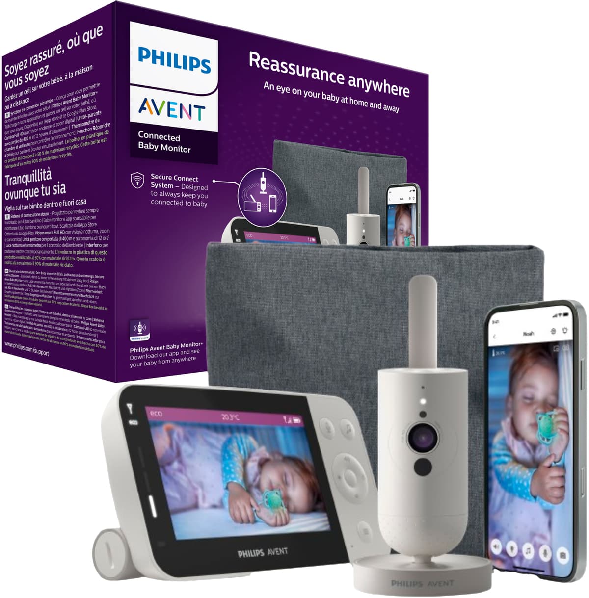 Philips Avent babycall SCD953/26 har en 4,3-tommers LCD-fargeskjerm og Full HD-kamera. Secure Connect-systemet sikrer en stabil forbindelse i hele hjemmet ditt, mens Baby Monitor+-appen lar deg følge med på hva som skjer fra hvor som helst.Les mer om produktet