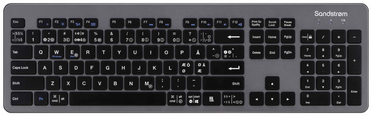 Med Sandstrøm slankt trådløst tastatur kan du skrive komfortabelt uten brysomme ledninger. Det slanke tastaturet i full størrelse er utstyrt med taster med saksemekanisme for presis skriving, og kommer med et nordisk tastaturoppsett.Les mer om produktet