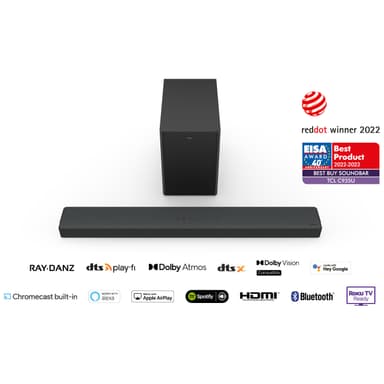 Oppgrader TV-lyden med TCL C935U 5.1.2 kanals lydplanke. Enestående lyd er levert gjennom WiFi, Bluetooth eller kablet tilkobling. Pust liv i filmer og annet innhold med 5 høyttalere med Dolby Atmos, Hi-Res-lyd og 5.1.2 kanaler.Les mer om produktet