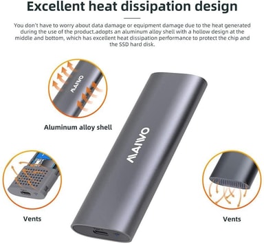 Maiwo K1689 er et unikt utvendig skap som støtter både M2. SATA og M2. NVMe SSD. Med USB3.2 Gen2-grensesnittet kan du overføre data opptil 10 Gbps (NVMe) og 6 Gbps (SATA). Maks SSD 2TBSpesifikasjoner: