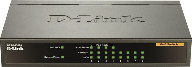 D-Link nätverksswitch, 8x10/100Mbps, 4xPOE, metallhölje, svartD-Link DES-1008PA med 4 PoE portar gör det enkelt att ansluta och strömförsörja Power over Ethenet (PoE) enheter såsom trådlösa åtkomstpunkter, IP-kameror och IP-telefoner och samtidigt lä