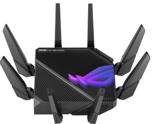 Asus ROG GT-AXE16000 router gir rask, pålitelig og stabil forbindelse til alle enhetene dine. Quad-band-routeren dekker et større område takket være åtte kraftige antenner. Med overføringshastigheter opptil 16000 Mbps trenger du ikke bekymre deg for at kvaliteten faller mens du spiller, strømmer eller ser på film. Funksjonen for VPN-fusjon sørger for at forbindelsen både er rask og sikker.